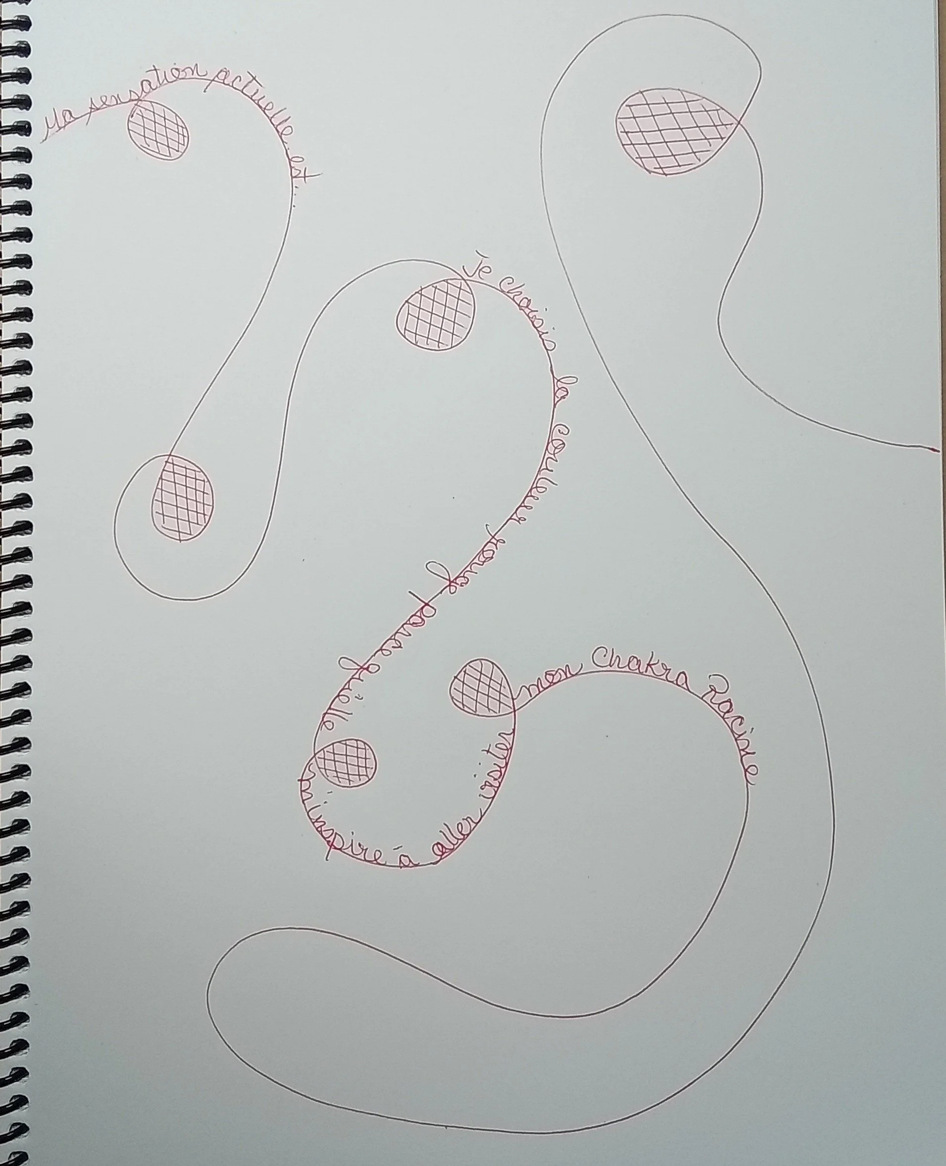 « Posez la pointe de votre crayon sur une page de votre journal. Sans penser ni rien diriger, laissez votre main tracer un fil libre, continu. Montez et descendez, tournez le cahier, faites danser votre trait. Suivez votre impulsion, restez à l’écoute du mouvement.