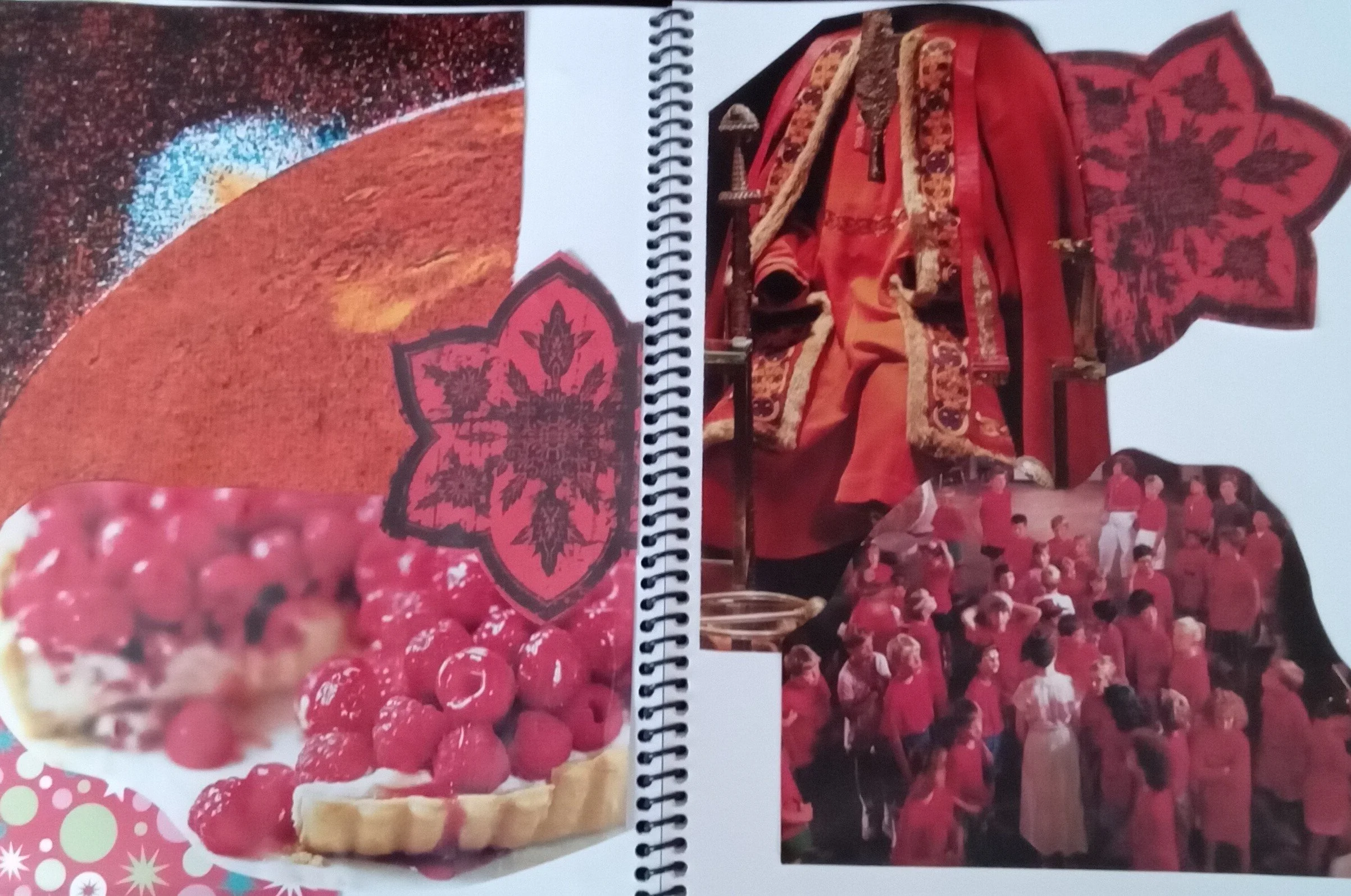 Je pars à la recherche d’image et de papier qui contient la couleur que j’ai choisie. Je fais un collage sur une double page de mon Journal Créatif.