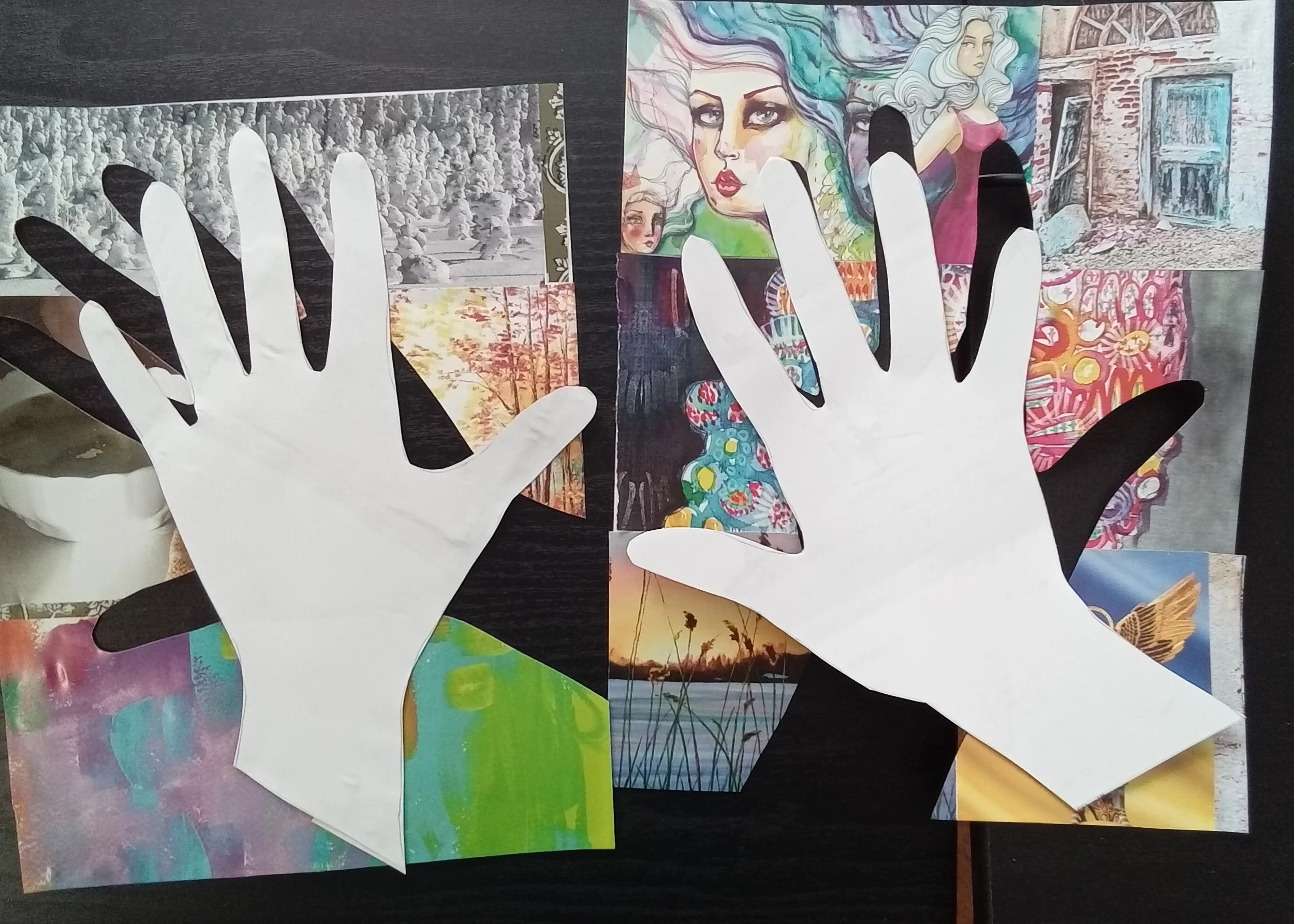À l’intérieur d’une des mains, je fais une liste de ce que je vis avec mes mains, ce que je fais avec elle.