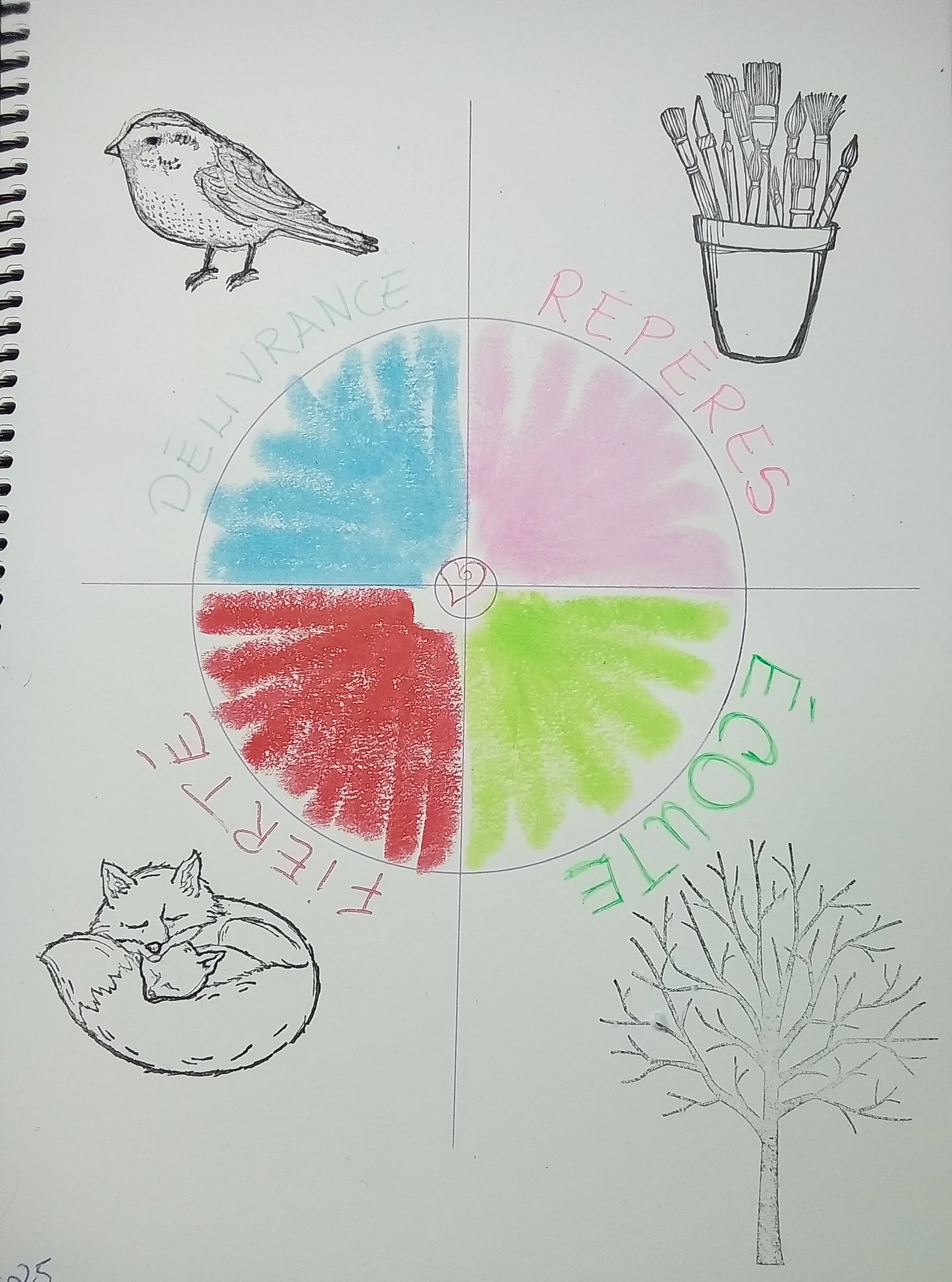 Sur le contour du cercle, pour chaque évènement, j’écris un mot qui évoque ce que j’ai vécu.